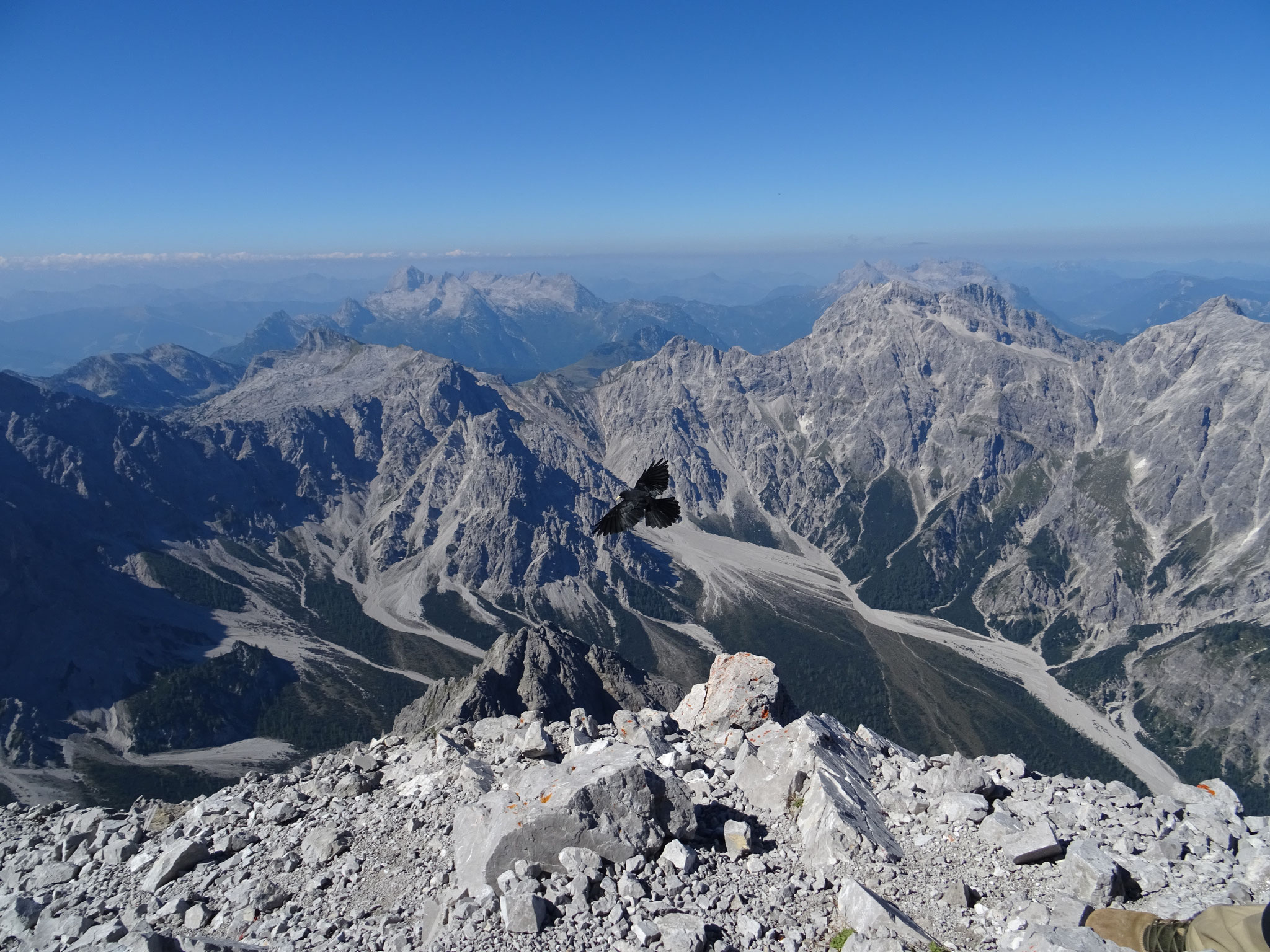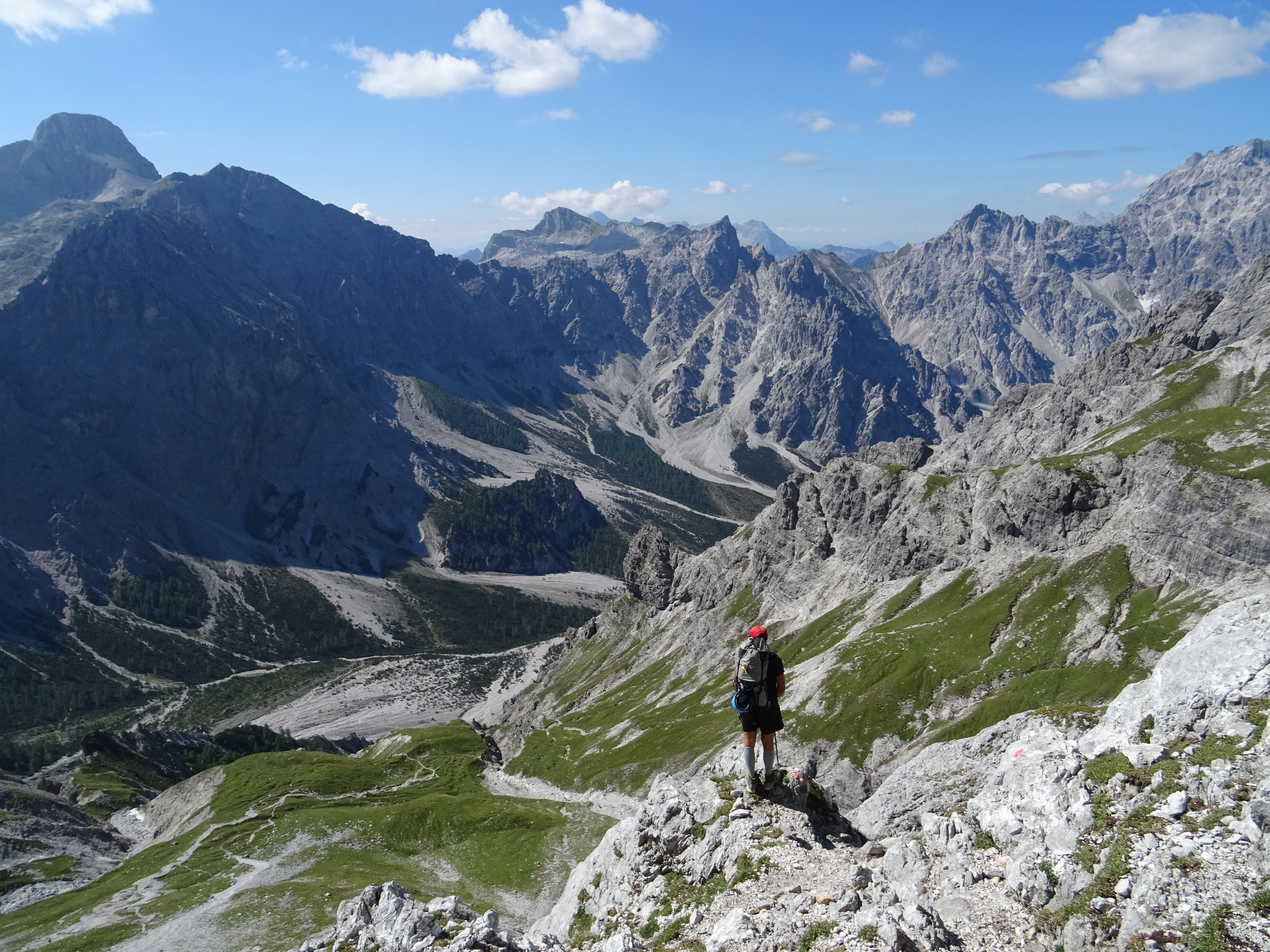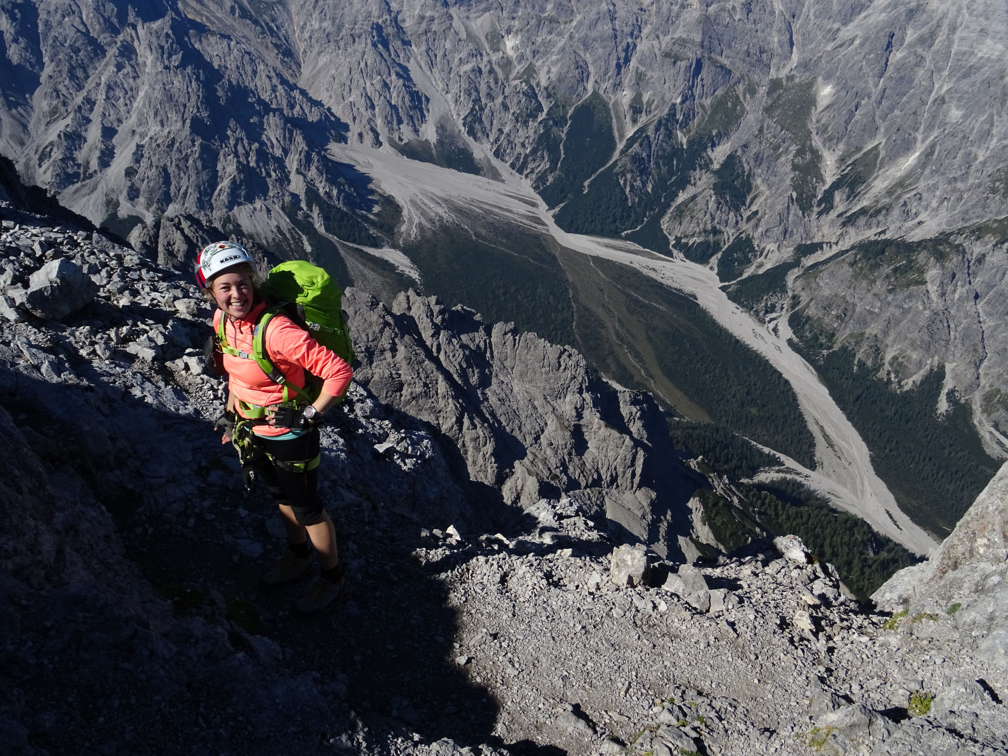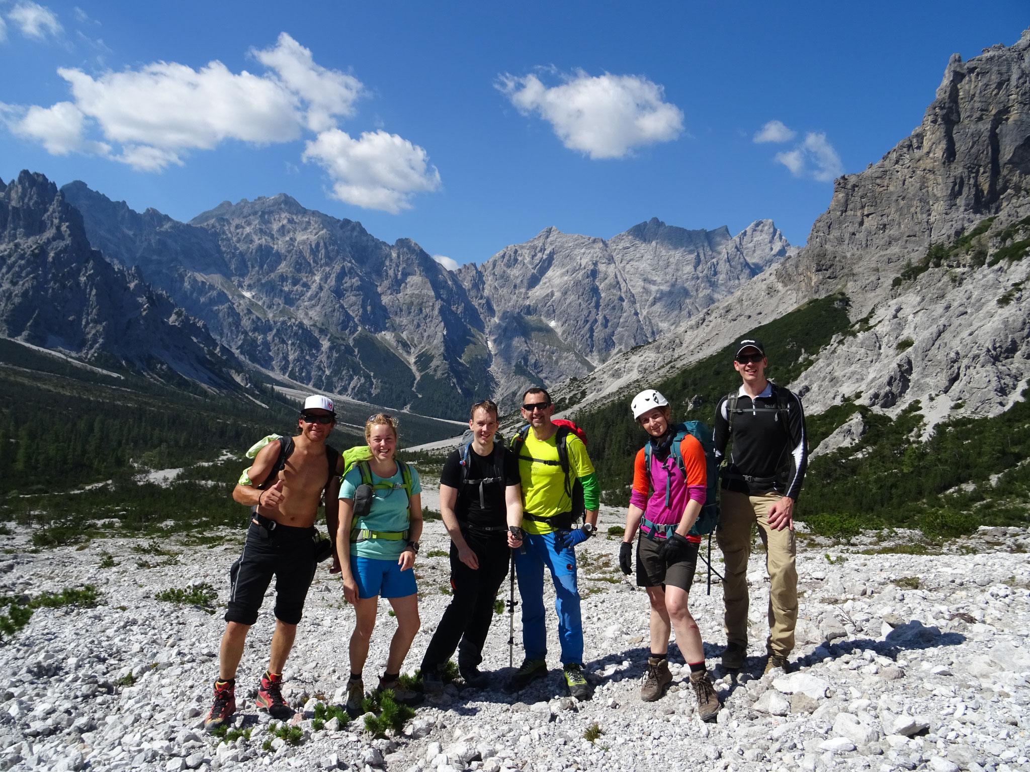 es nun, immer noch steigend und kletternd, hinab über die Südflanke ins Wimbachgries. Dieser Abschnitt erstreckt sich über eine Länge von 1300 hm über Geröll und Felsen. Der Abstieg stellt eine