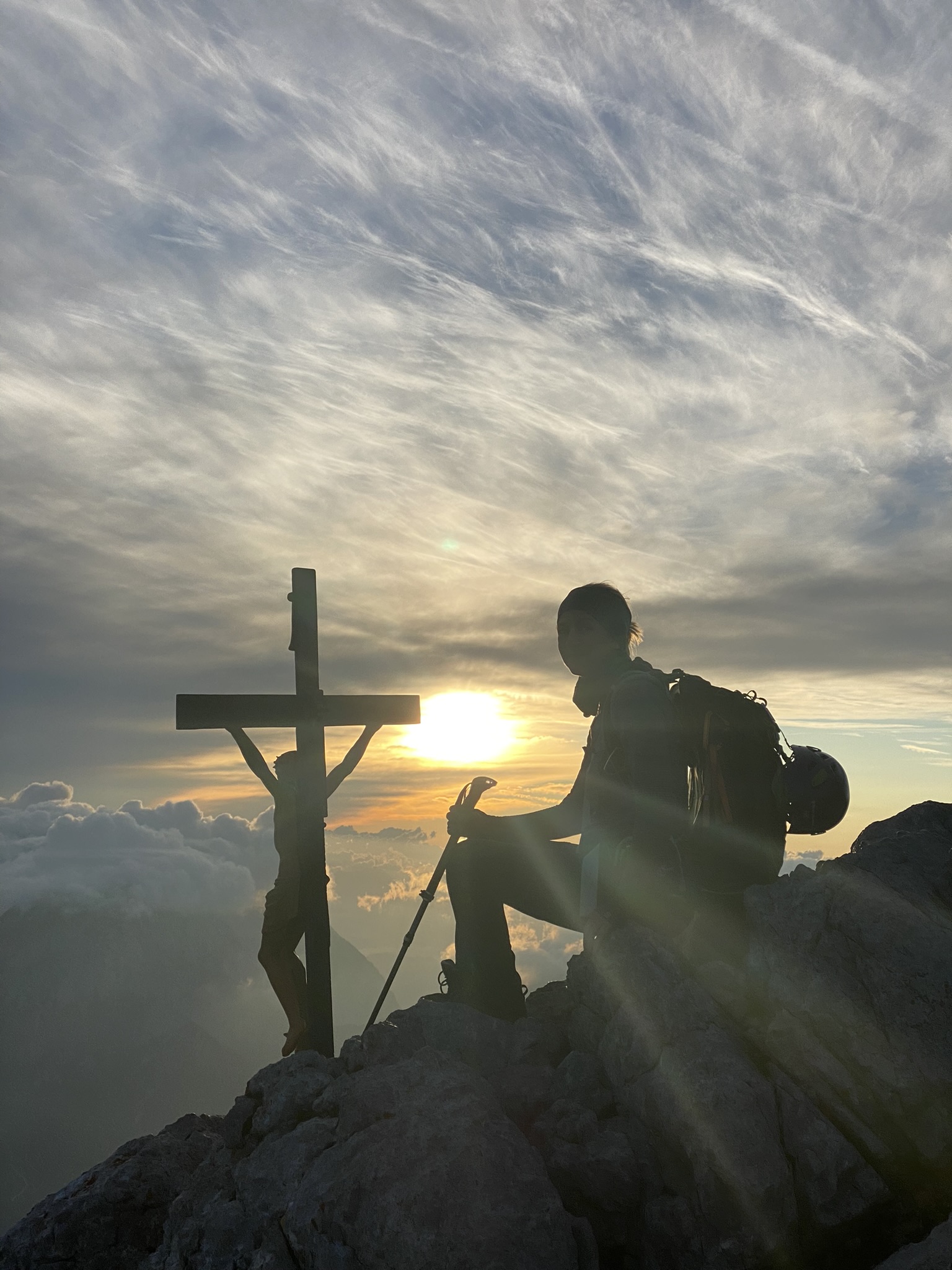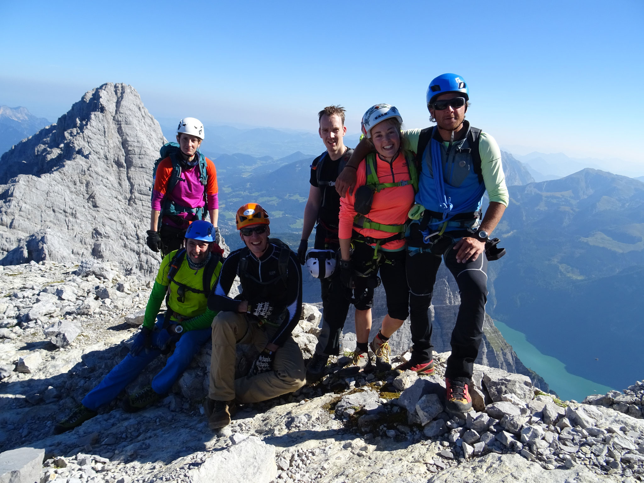 und Felsplatten auf den ersten Gipfel, das Hocheck (2651 m). Hier angekommen machen wir eine kurze Rast und legen das Klettersteigset und den Klettergurt an. Weiter geht es nun gut mit
