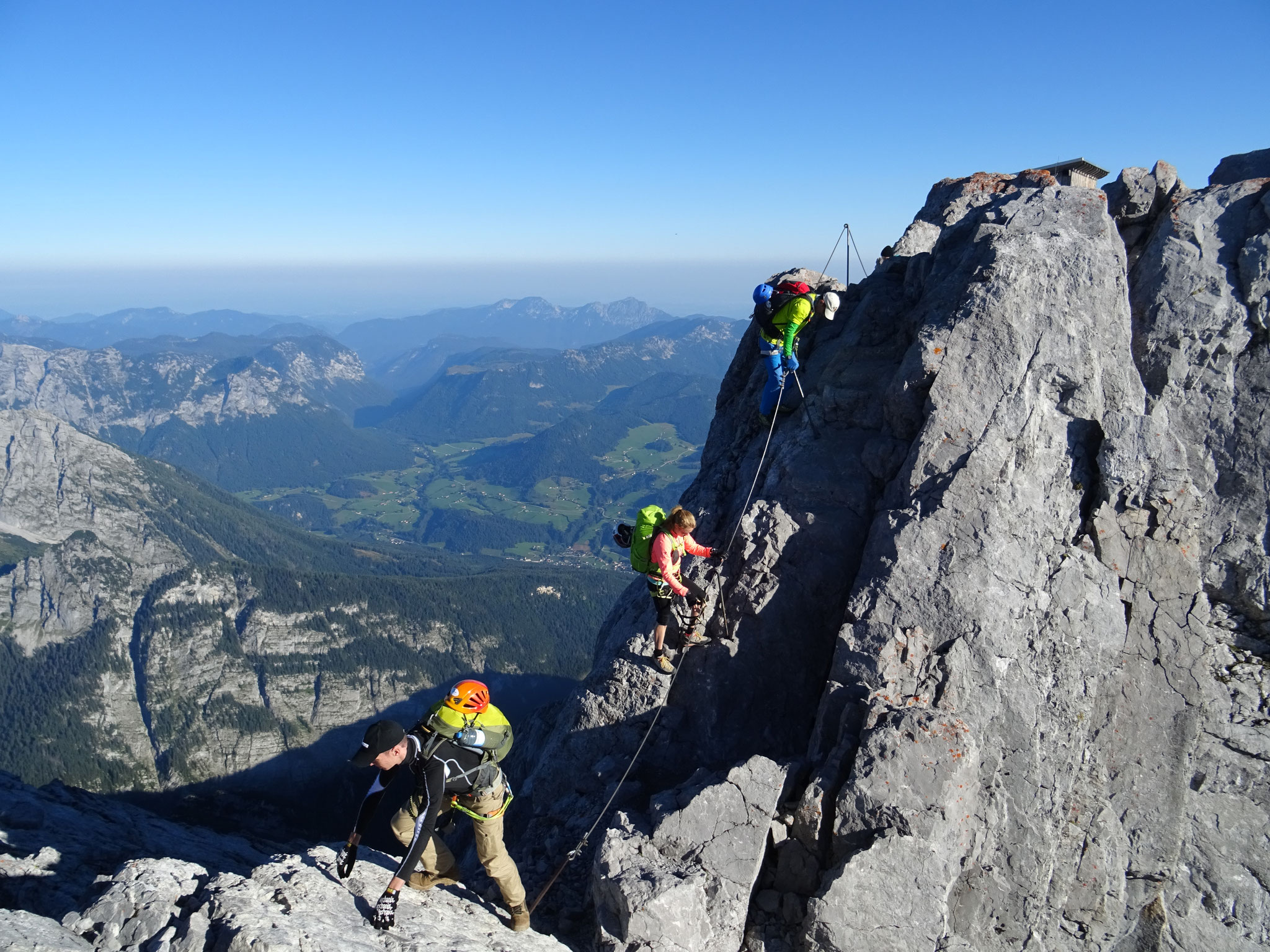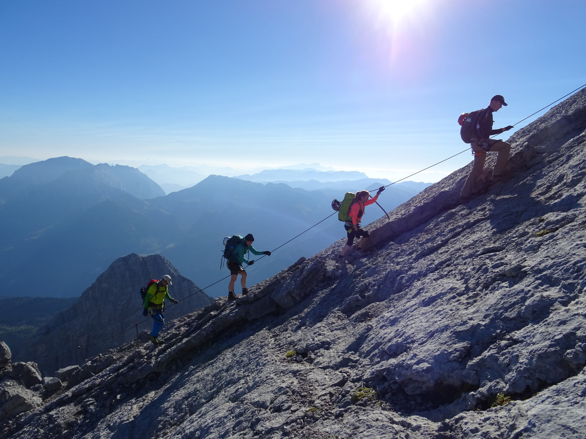 Früh starten wir zum heutigen Ziel, der Watzmannüberschreitung. Über Geröll und Schrofen steigen wir hinauf, bis wir die erste drahtseilversicherte Felsstufe erreichen. Weiter geht es über Geröll