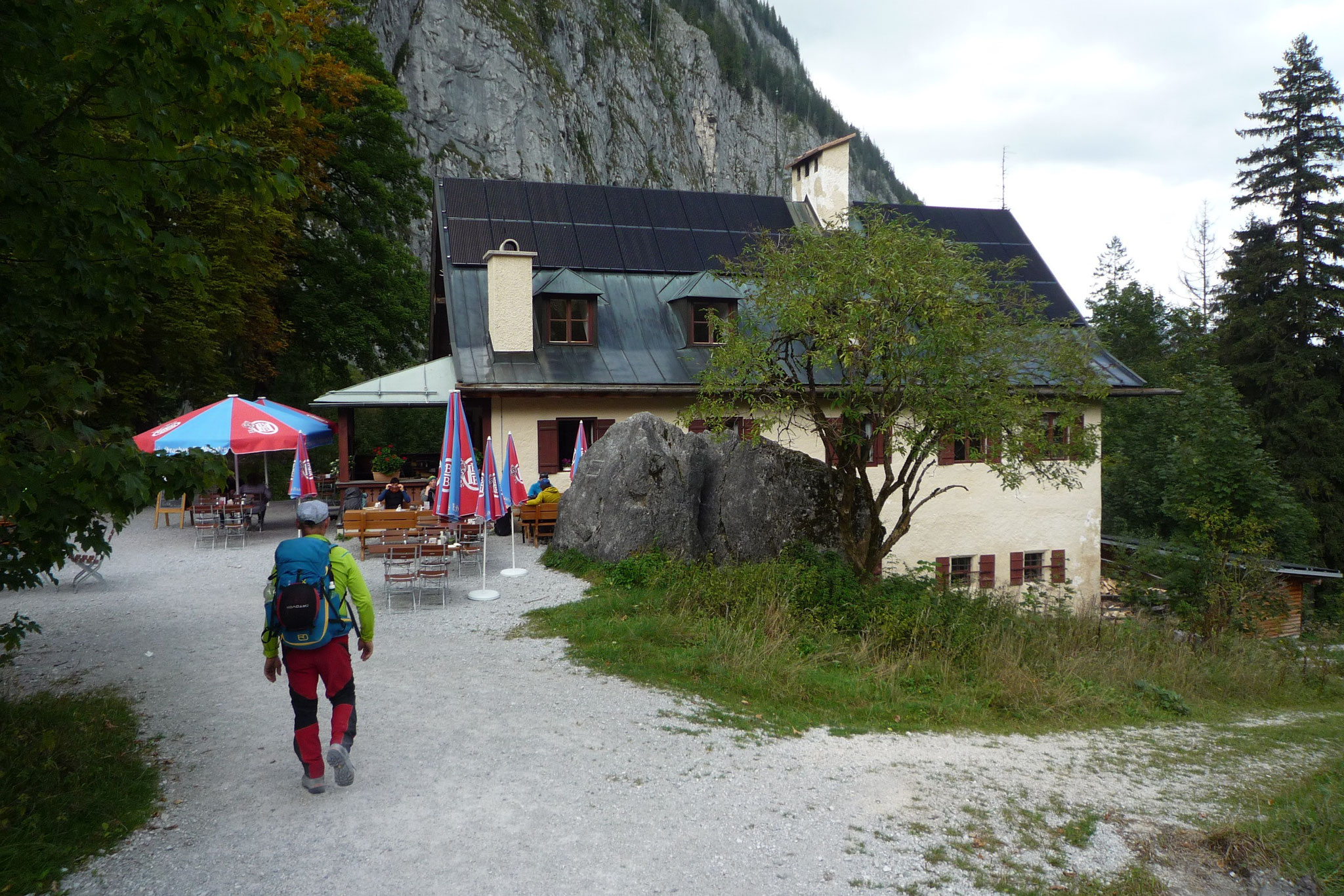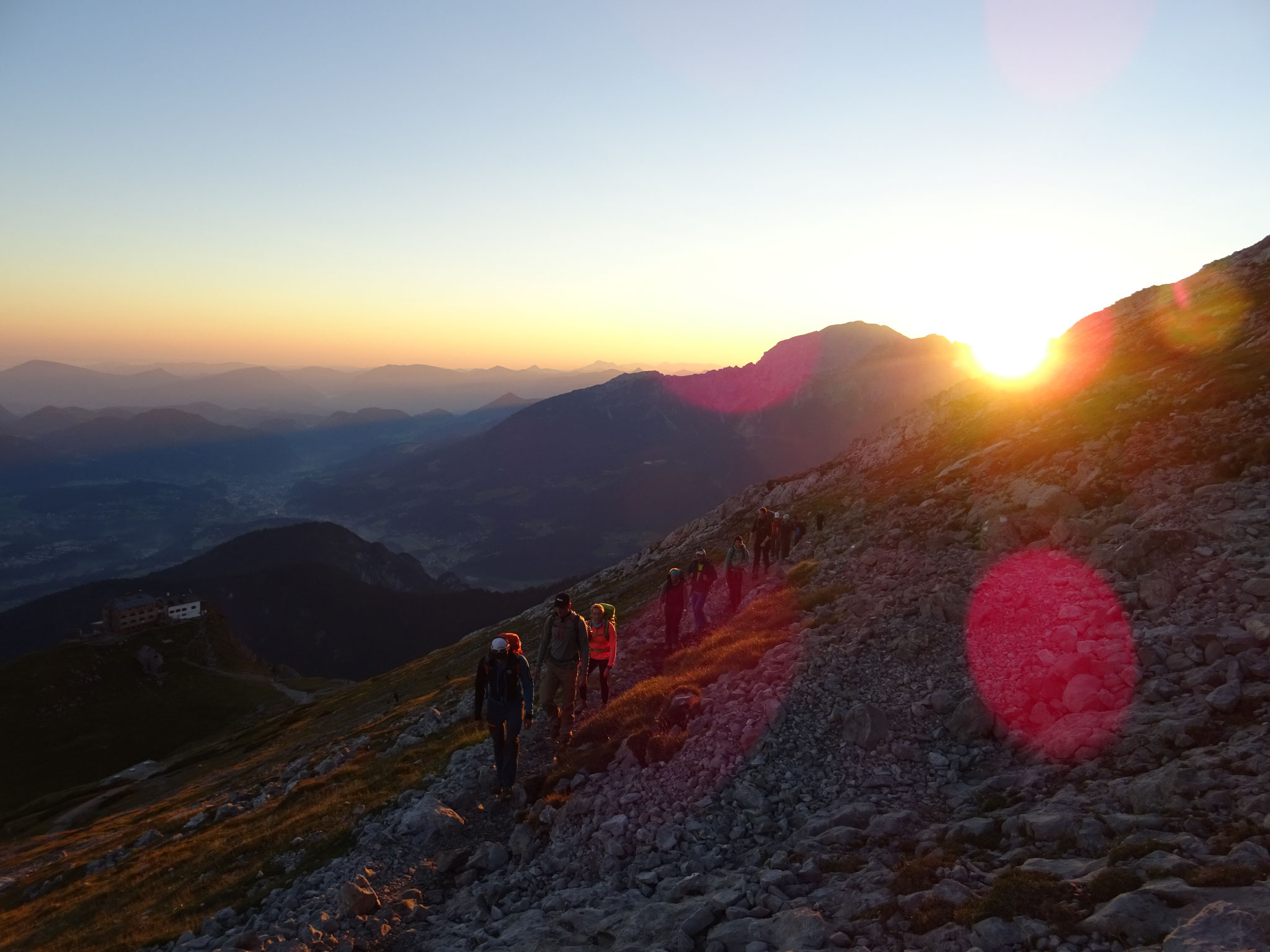 zum Falzköpfl hinauf und haben das Watzmannhaus erreicht. Einen wunderschönen Blick auf die Berchtesgadener Bergwelt haben wir von der Terrasse aus. Wir besprechen den nächsten Tag und freuen uns