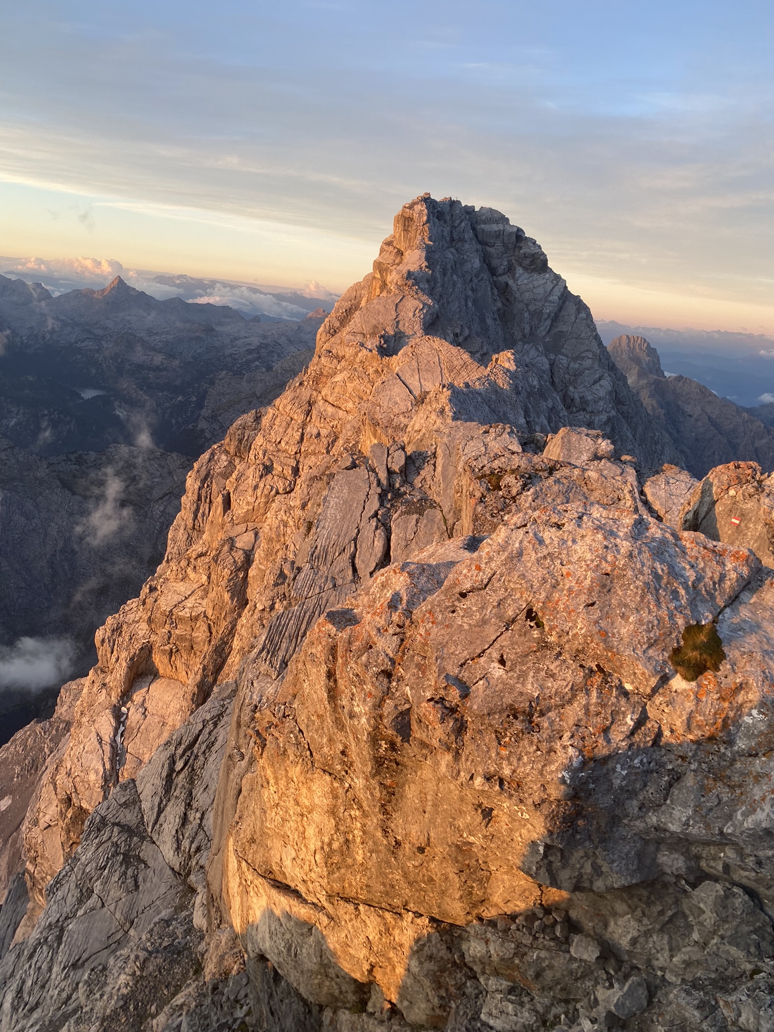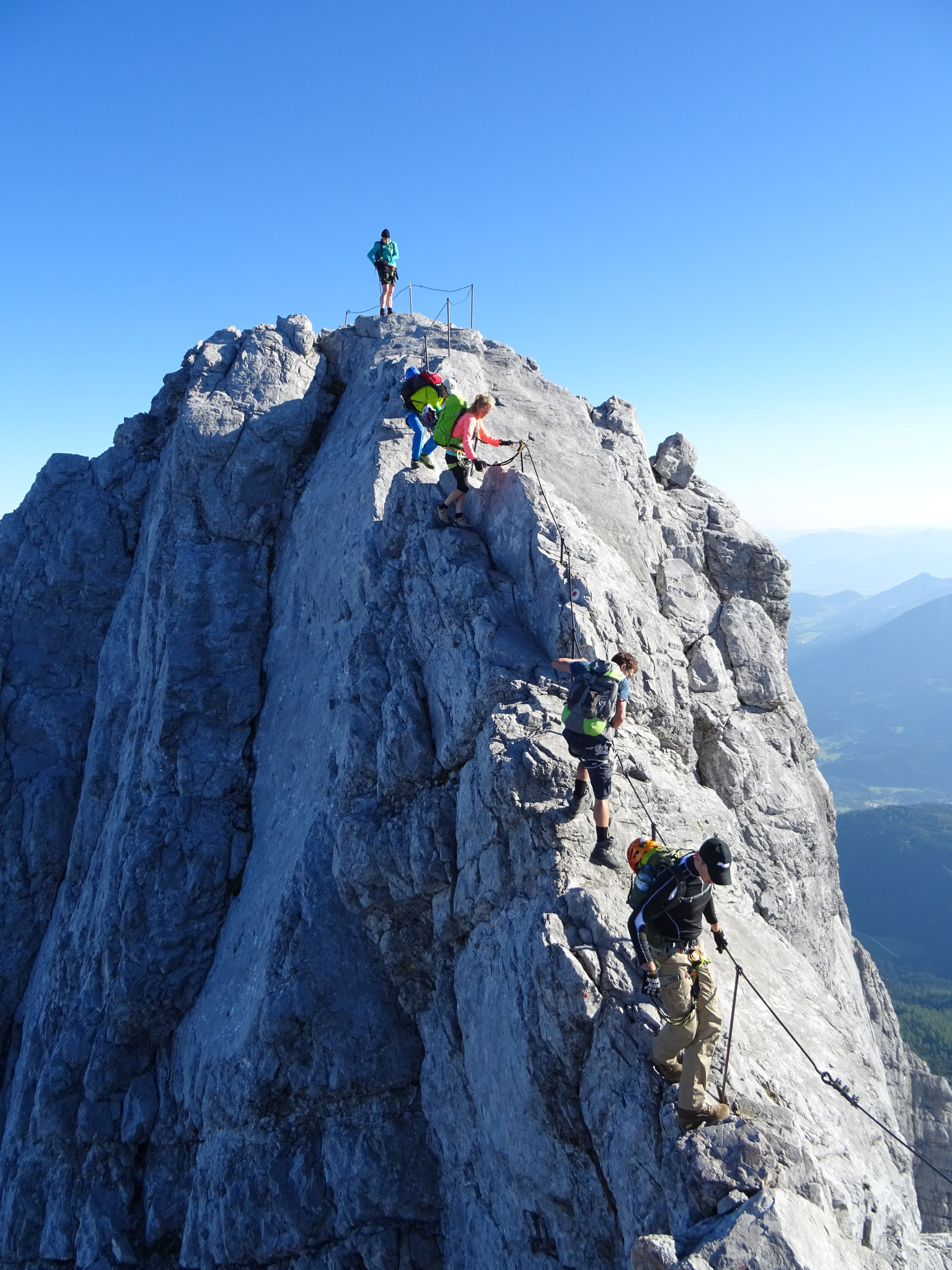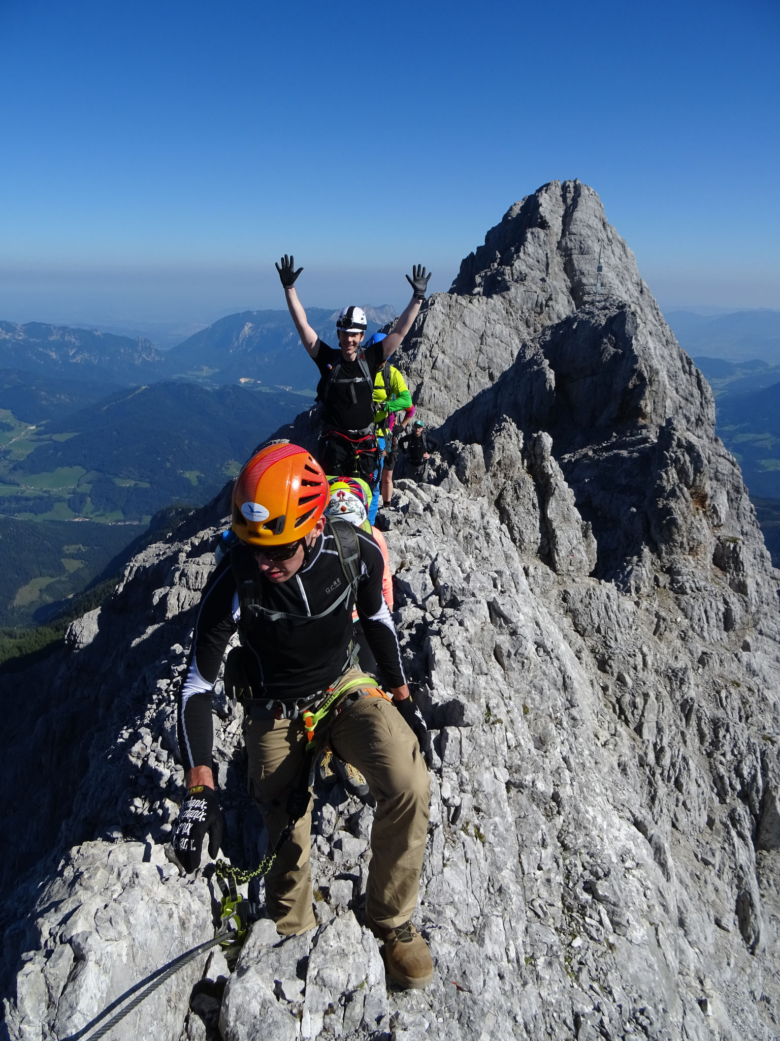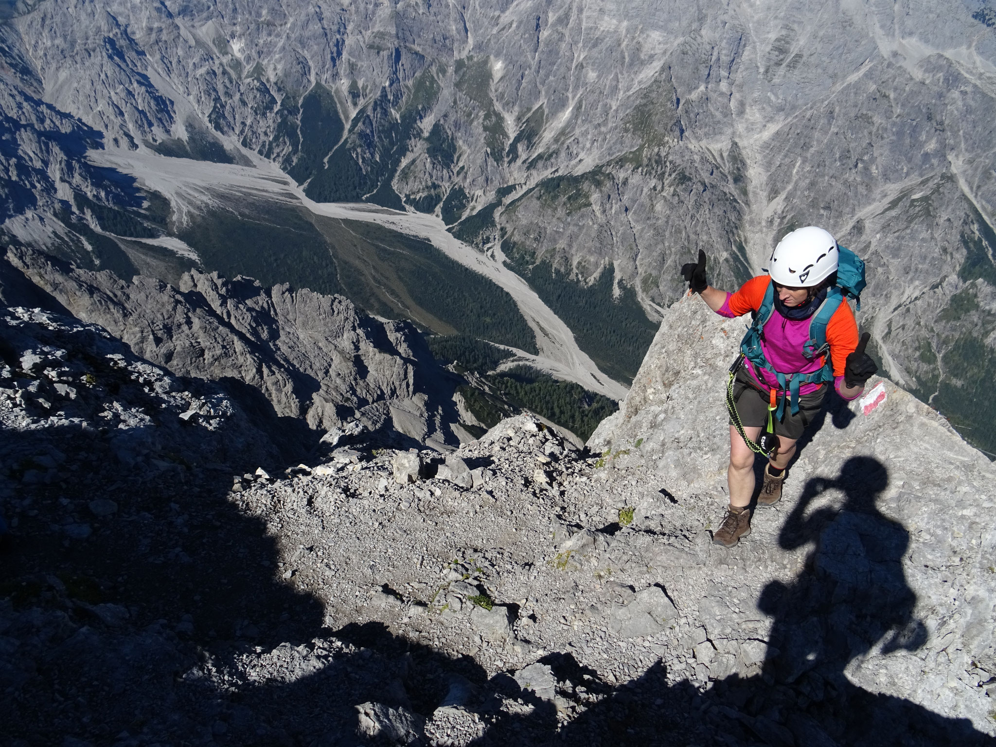 Drahtseilen versichert, mal direkt auf dem Grat, mal auf seiner Westseite in leichter Kletterei, bis auf die Mittelspitze (2713 m). Von hier klettern und steigen wir auf und neben dem Grat,