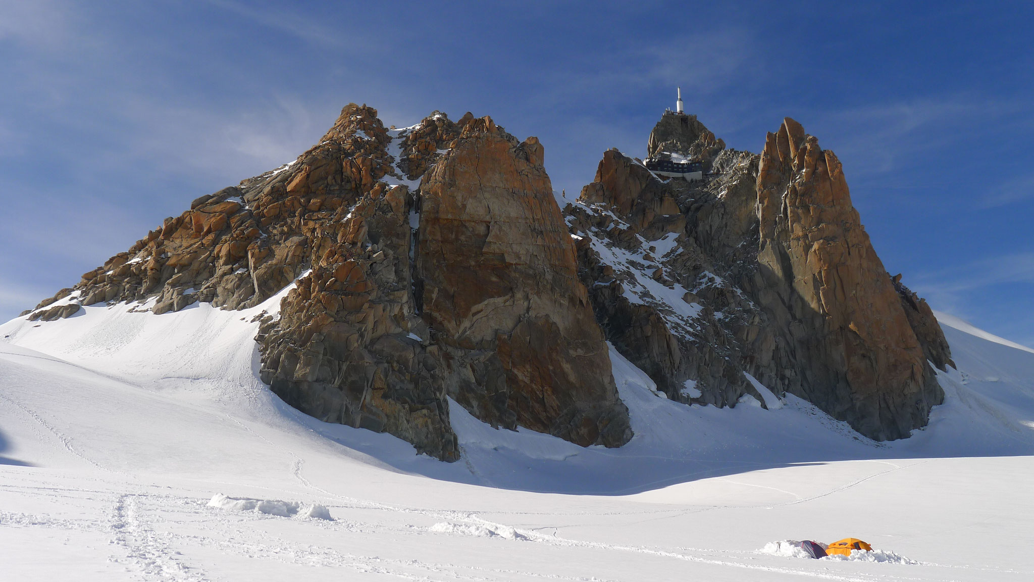 Treffpunkt um 12 Uhr in Chamonix. Nach Material- und Ausrüstungscheck Bergfahrt mit der Seilbahn auf die Aiguille du Midi. Nach kurzem Abstieg