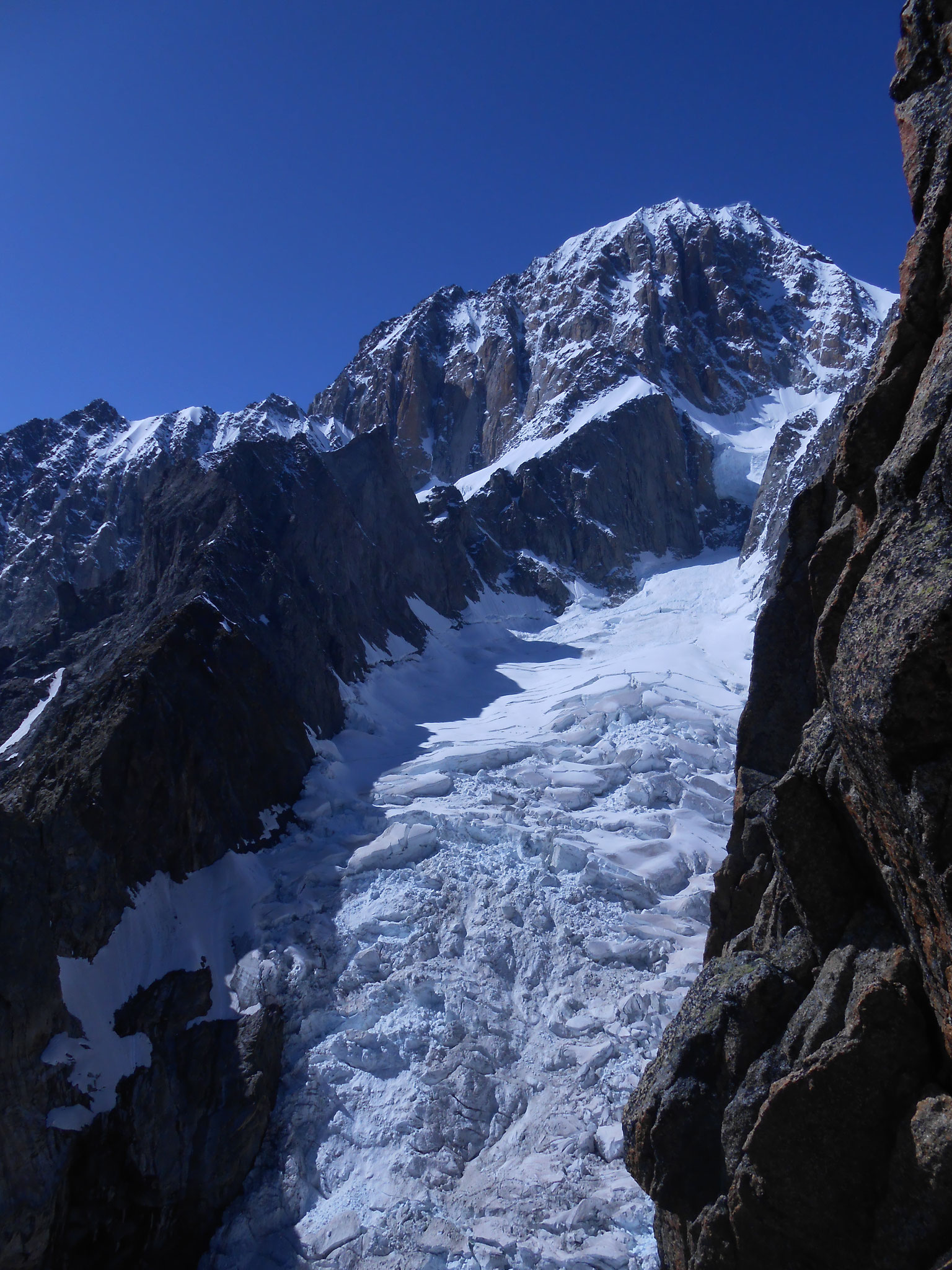 Am Morgen geht es früh los. Noch im dunklen durchqueren wir das „Grand Couloir“, eine nach Sonnenaufgang durch Steinschlag sehr gefährdete Rinne. Nach ca. 2 h